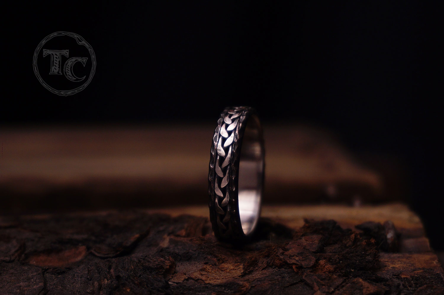 TuoniCorun punossormus, patinoitu malli. Perinteikäs kuvio on käsin punottua hopeaa. Teräsrunko luo punokselle kontrastia ja vahvistaa punosta estäen samalla mahdolliset sormen värjäytymät, mitä jotkut metallit ihoa vasten pidettynä saattavat aiheuttaa. Sormus valmistetaan rungon sorvauksesta lähtien kotimaisena käsityönä.