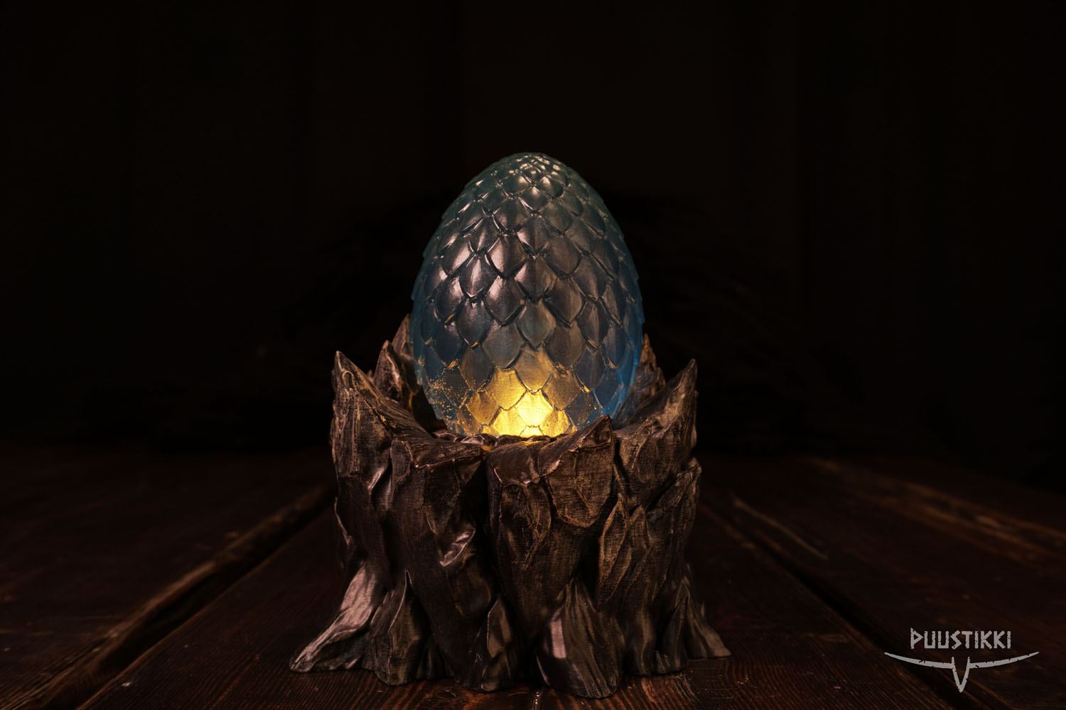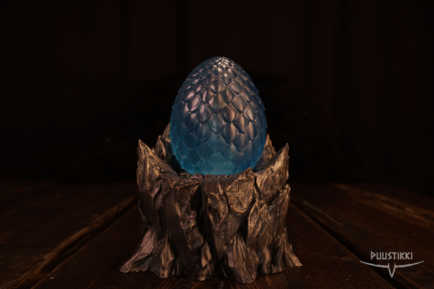 Puustikin lohikäärmeenmunat tehdään meidän verstaalla käsin valamalla ja jokainen värjätään yksitellen, joten niissä on aina pieniä poikkeamia, eikä kahta täysin identtistä ole. Seassa oleva hopea- ja kultahile tuo ripauksen taianomaisuutta lohikäärmeenmunalle. Kalliomainen jalusta tukee lohikäärmenmunan mystiikkaa ja näyttävää ilmettä vielä entisestään.