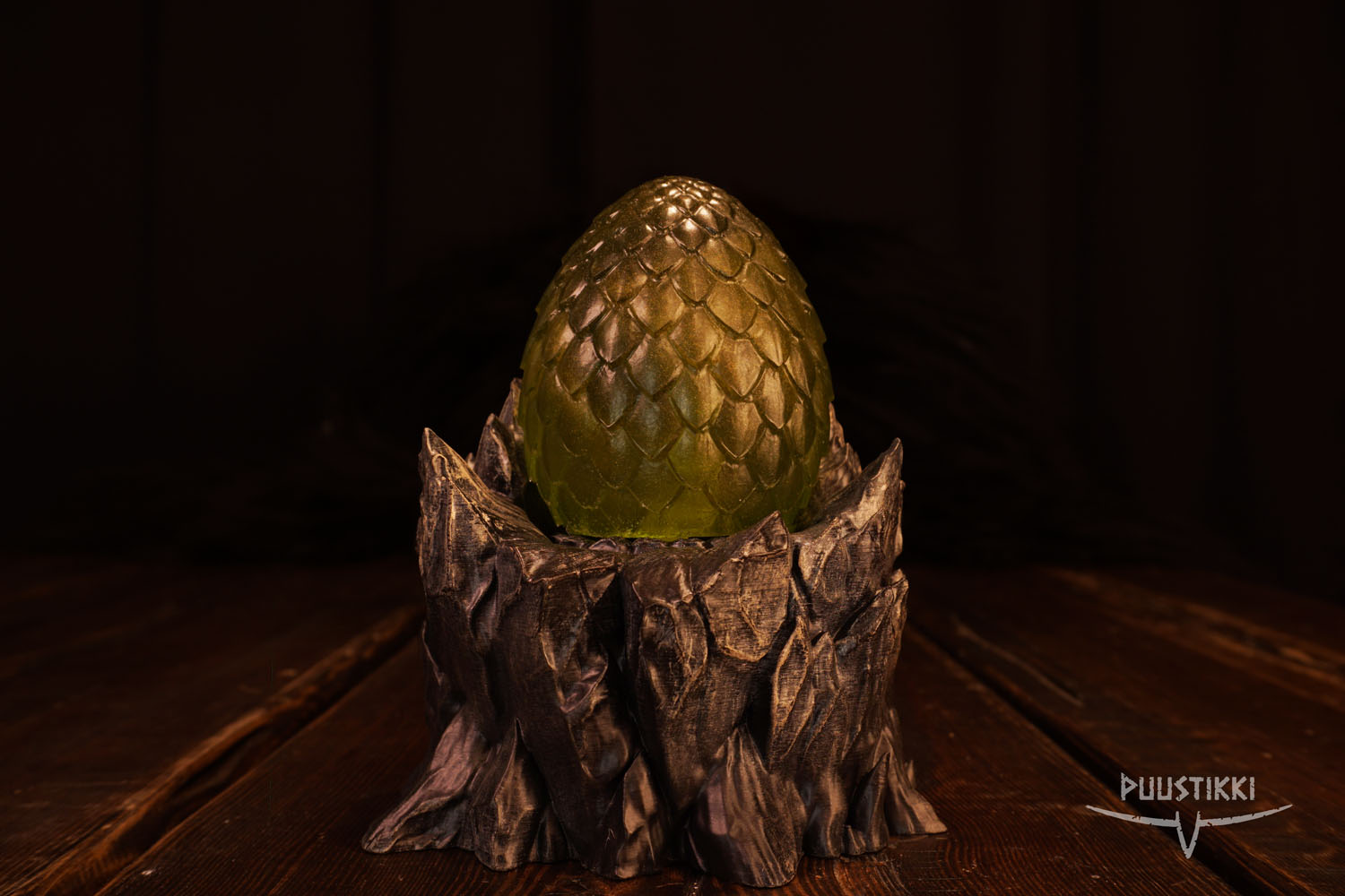 Puustikin lohikäärmeenmunat tehdään meidän verstaalla käsin valamalla ja jokainen värjätään yksitellen, joten niissä on aina pieniä poikkeamia, eikä kahta täysin identtistä ole. Seassa oleva hopea- ja kultahile tuo ripauksen taianomaisuutta lohikäärmeenmunalle. Kalliomainen jalusta tukee lohikäärmenmunan mystiikkaa ja näyttävää ilmettä vielä entisestään.